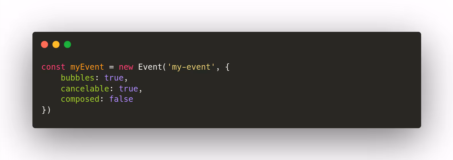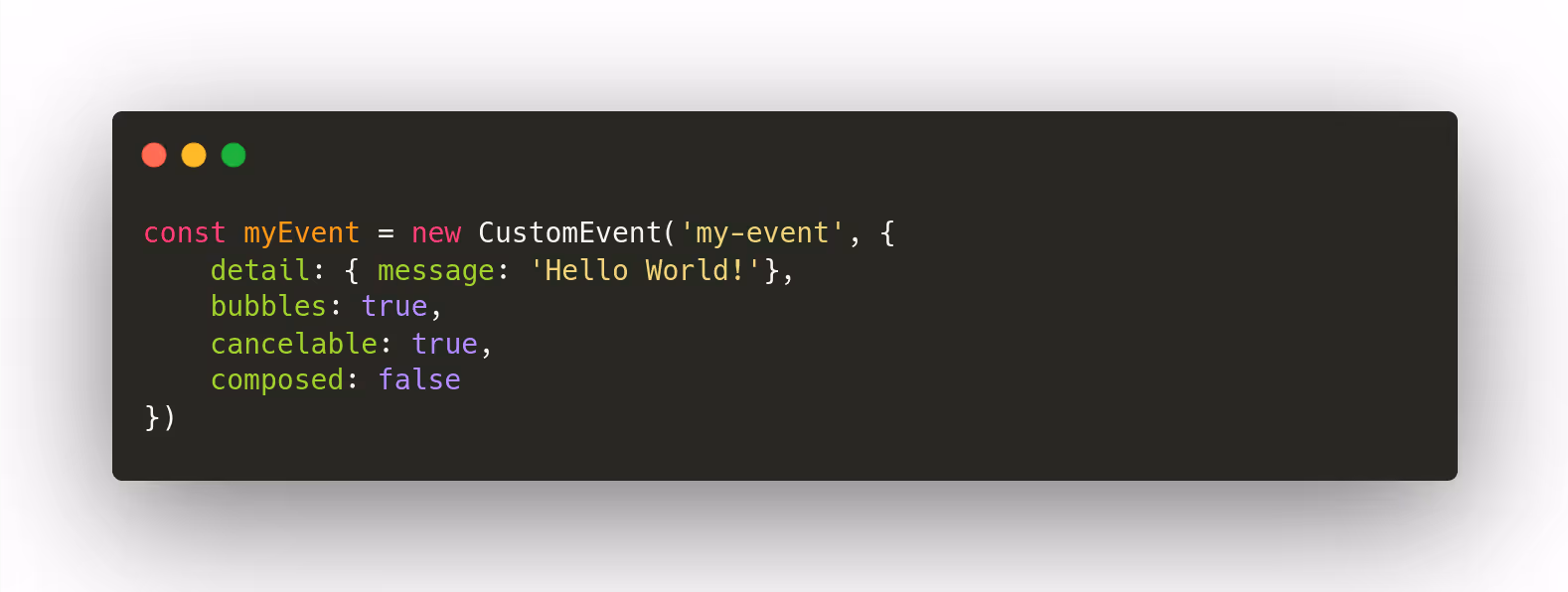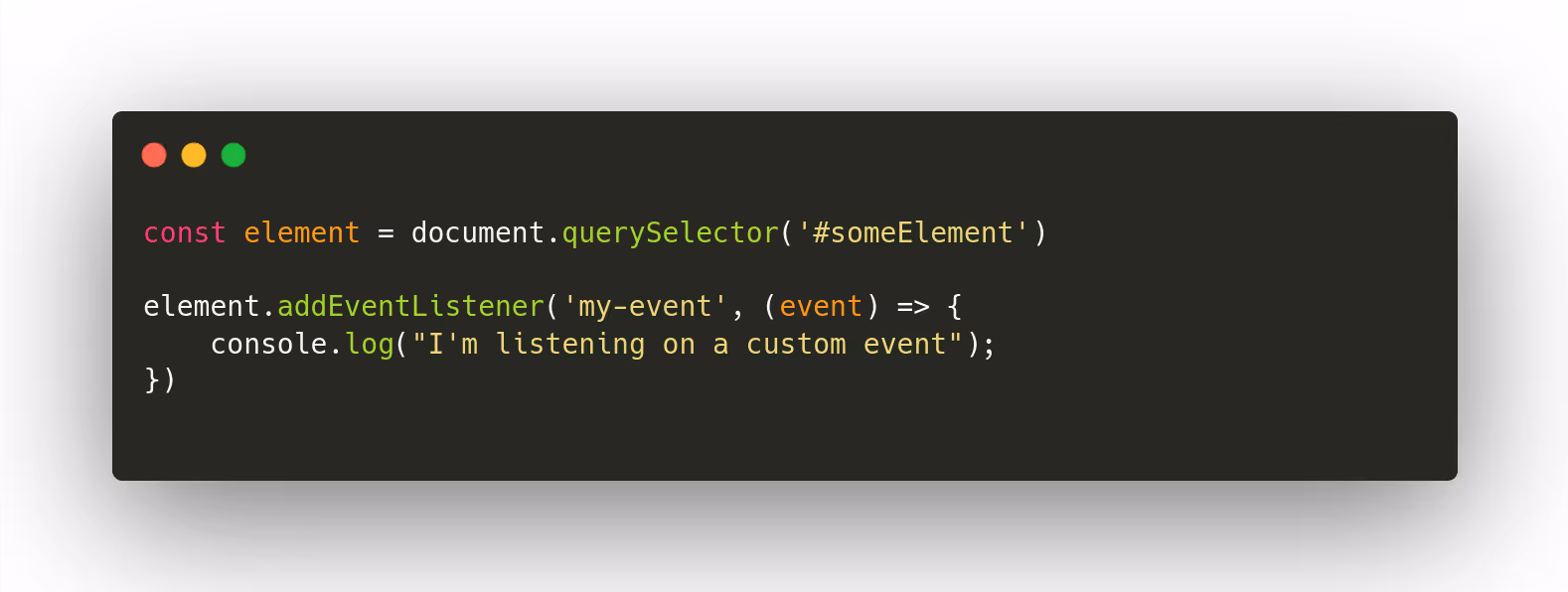 In the above snippet, we created an event by passing the event name as the first argument. This string can be the name of a built-in event like “click” or “input” or our own like “my-event”.